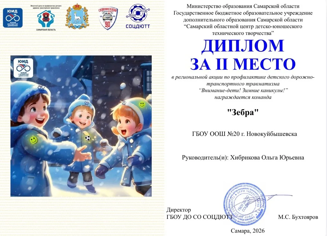 Наш отряд юных инспекторов движения «Зебра» занял 2 место в региональной акции по профилактике детского дорожно-транспортного травматизма «Внимание-дети! Зимние каникулы!»